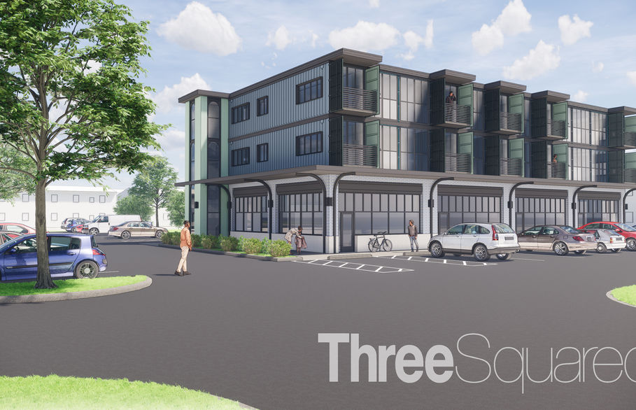 Planned just a stone’s throw from the Detroit Metro Airport and the new Amazon fulfillment center, this project will provide a much needed commercial oasis and housing options for young professionals and locals looking for a change of pace. The front of the building consists of two levels of container apartments raised on top of a reinforced concrete structure housing four commercial tenants set to include a cafe and a grab-and-go sandwich shop.