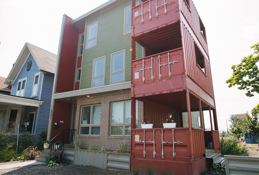 Our three story, two-unit Model Center was erected in just 6 hours and 15 minutes in 2015. The 2,800 sq ft model unit features an open concept inside with exposed steel. It includes two units to show prospective buyers a two-story, two-bedroom unit as well as a one-bedroom unit on the third floor. Each has balcony space made from containers.