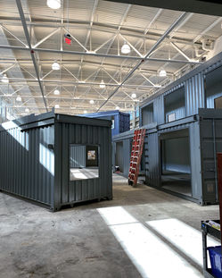 The design features a second level concrete and third level concrete deck on top of containers: our first container ramp up to the podium, a second level fireman’s pole to slide to the lower level, and a cargo net lounge on the second level where workers can lay back and relax during breaks!